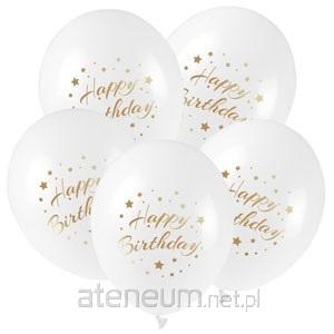 Urodzinowe balony lateksowe w kolorze białym z dwustronnym nadrukiem "Happy Birthday". Nadruk wykonany w złotym kolorze. Dekoracja na przyjęcie urodzinowe. Możliwość napełnienia helem lub powietrzem. Wykonane z naturalnego lateksu kauczukowego. Balony wielkości 28 cm. 5 sztuk w opakowaniu. Produkt zaprojektowano i wyprodukowano w Polsce.