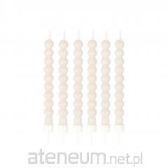 Białe świeczki urodzinowe z podstawkami do dekoracji tortu. Wysokość świeczki 6 cm. Opakowanie zawiera 24 świeczki i 12 podstawek.