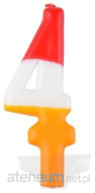 Świeczka urodzinowa w kształcie cyferki wykonana z trójkolorowego wosku: czerwonego, białego i żółtego. Wysokość świeczki 10,5 cm.