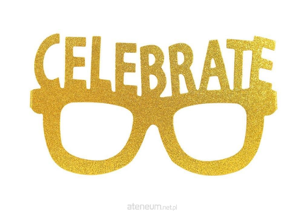 Złote okulary brokatowe wykonane z papieru. W górnej, frontowej części okularów znajduje się napis ""Celebrate"". Gadżet do wspólnego świętowania różnych okazji lub powitania Nowego Roku. Okulary nie posiadają szkieł - są bezpieczne dla oczu. W opakowaniu znajdują się 4 sztuki.