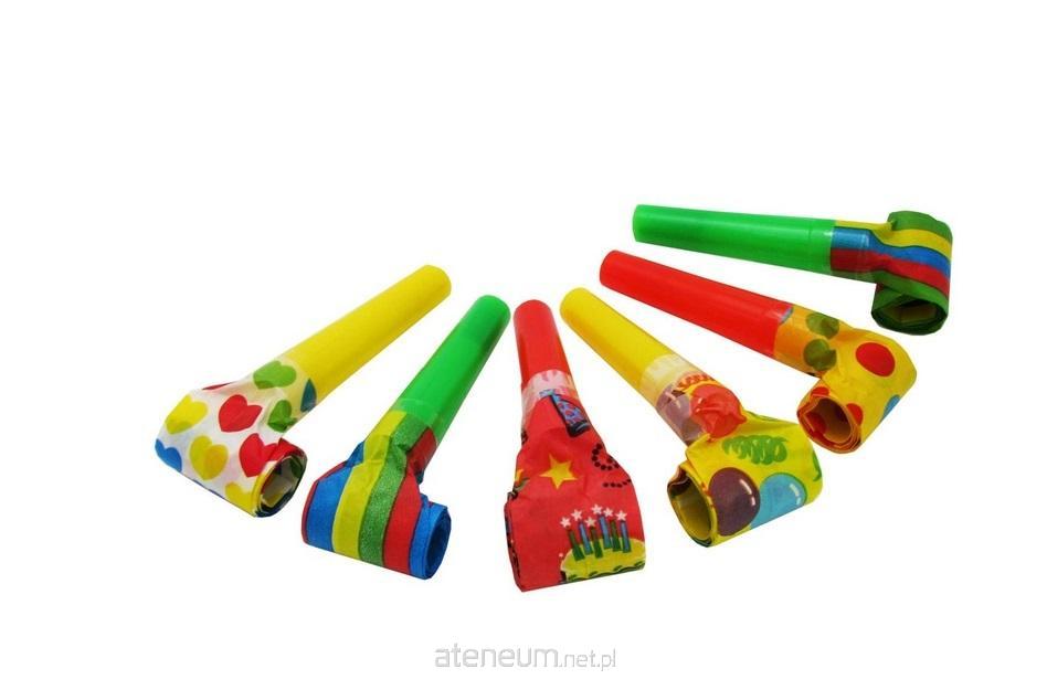 Zestaw 6 papierowych gwizdków we wzorki. Wymiar rozwiniętego gwizdka: 2,5cm x 35cm.