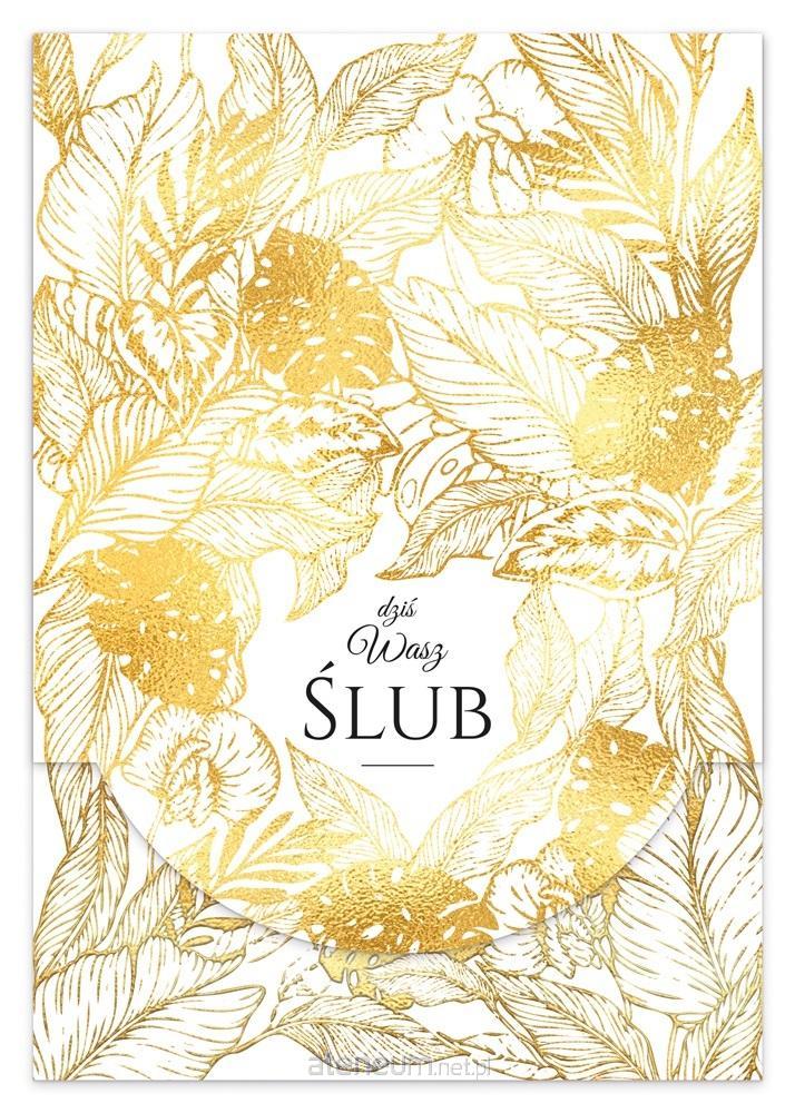 Karnet z kieszonką na pieniędze w formacie B6, składany w poziomie. Złocony i tłoczony, teksy życzeń w środku. Wydrukowany na wysokiej jakości papierze. W zestawie koperta.