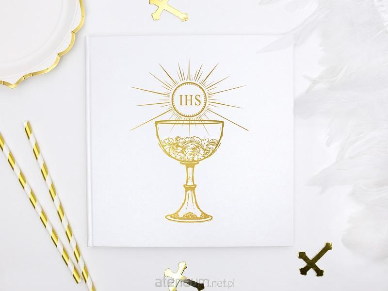 Księga Gości Komunijnych oprawiona perłowym papierem w kolorze białym, ze złotym kielichem, 20,5x20,5 cm, 22 kartki. Posiada dwie pierwsze strony nadrukowane (do wpisania danych i wklejenia zdjęcia).