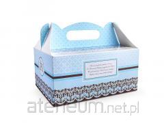 Ozdobne pudełka na ciasto komunijne z papieru z kolorowym nadrukiem i wierszykiem, wymiary pudełka po złożeniu 19x14x9 centymetrów.(1 op. / 10 szt.)