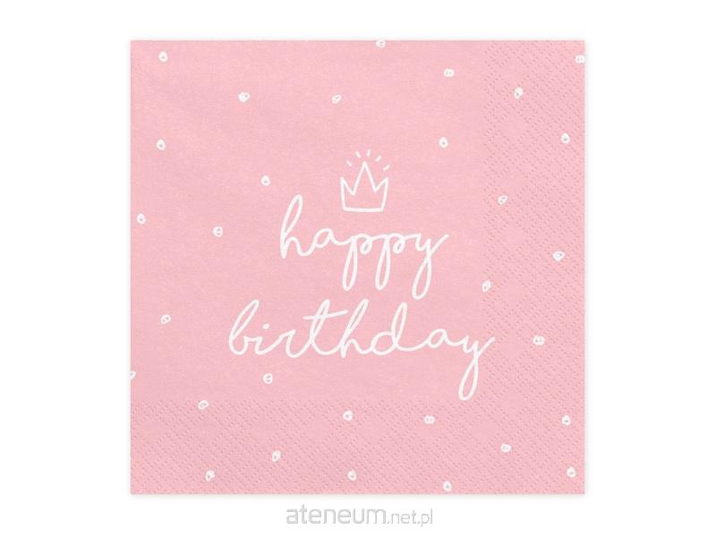 Serwetki trójwarstwowe Happy Birthday w kolorze jasnoróżowym z białym nadrukiem, wymiary 33 x 33 cm.(1 op. / 20 szt.)