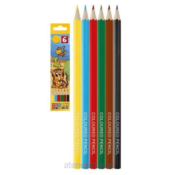 Sześciokątne, w drewnianej, lakierowanej oprawie. Ergonomiczny kształt kredek doskonale pasuje do dziecięcych dłoni. W kartonowym, kolorowym pudełku z motywami zwierzątek. W zestawie 6 kolorów kredek. Długość kredek: 17.5 cm. Średnica kredek: 7 mm.