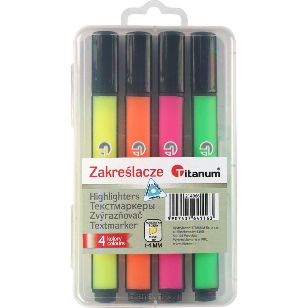 Zakreślacze o ergonomicznym trójkątnym kształcie, ze ściętą końcówką. Wyposażone w bezpieczną wentylowaną skuwkę. Nietoksyczny atrament, na bazie wody. Grubość linii pisania 1-4 mm. Zestaw zawiera 4 kolory w praktycznym plastikowym etui.