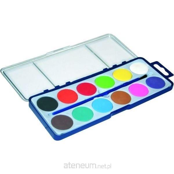 Zestaw farb akwarelowych w postaci suchych guziczków, umieszczonych w plastikowym opakowaniu z zawieszką. Po zwilżeniu wodą niemal natychmiast uzyskuje się gotowe do użycia farby. W komplecie pędzelek. Farby akwarelowe to farby wodne służące do malowania na papierze. Szybko schną. W zestawie 12 kolorów farb. Średnica guziczka z farbą: 28 mm.