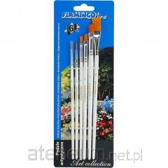 Zestaw 5 pędzli artystycznych z włosiem syntetycznym. Idealnie nadają się do bardzo precyzyjnego malowania. Gwarantują niezwykłą precyzję przydatną przy kreowaniu wszelkiego rodzaju niewielkich detali i wykończeń. Idealne do zastosowań szkolnych, domowych oraz dla artystów na każdym poziomie zaawansowania. Doskonale nadają się do farb olejnych, akrylowych, akwarelowych, gwaszy oraz farb do tkanin. Sprawdzą się również doskonale w technice decoupage podczas wykonywania drobnych detali. Wytrzymałe drewniane uchwyty z oznaczeniem grubości pędzla. Rodzaj końcówki: płaska zaokrąglona. NR: 2,6,8,10,12 . Pakowane na blistrze po 5 sztuk