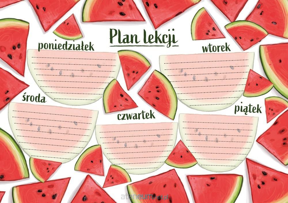 Plan lekcji w formacie A5, na odwrocie wydrukowana tabliczka mnożenia.