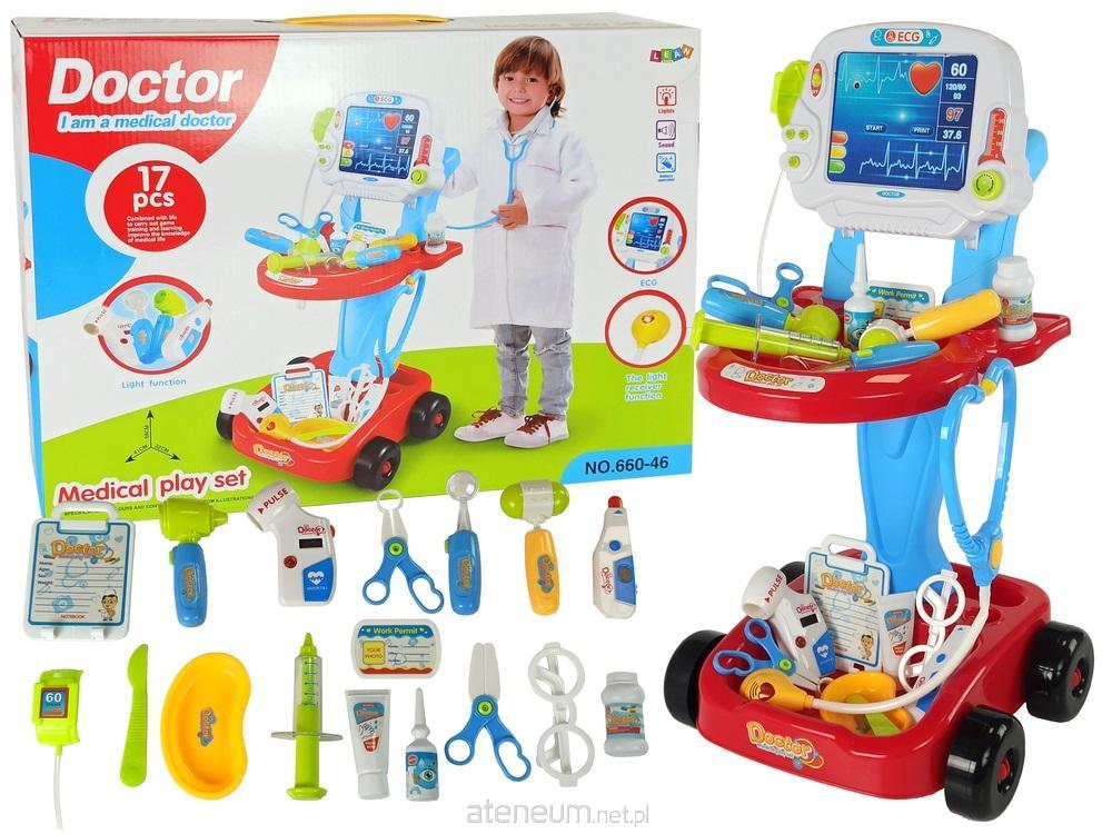 Zestaw Lekarski Na Wózku Lekarz EKG 17 Elementów Bogato wyposażony zestaw lekarski. Idealny dla małych miłośników zabawy w lekarza. Jeśli Twoje dziecko leczy wszystkie zabawki i twierdzi, że chce zostać lekarzem, wyposaż je w stoliczek medyczny z akcesoriami. Jego bogate, wieloczęściowe wyposażenie i estetycznie wykonane przyrządy medyczne pobudzą wyobraźnię dziecka i pozwolą mu połączyć fantastyczną zabawę z nauką i rozwojem własnych pasji. Starannie zrobione imitacje prawdziwych narzędzi medycznych ucieszą dziecko. W zestawie stabilny wózek na czterech kółkach z rączką, dwoma półeczkami na przedmioty lekarskie i tablicą. EKG sprawdzi się idealnie dla przyszłych, małych lekarzy. Elementy zestawu: - panel / wózek do EEG z możliwością przenoszenia lub przewożenia na kółeczkach (zasilany 2 bateriami typu AA - brak w zestawie) - okulary - stetoskop ze świecącym serduszkiem wydający dźwięk bijącego serca - termometr z możliwością regulacji temperatury i podświetlanym wynikiem - otoskop laryngologiczny z lampką, idealny do badania uszu pacjenta - ciśnieniomierz z regulowanym i podświetlanym wynikiem - młotek - strzykawka - lusterko dentystyczne z lampką - dwie pary nożyczek chirurgicznych - skalpel - basen - imitacja kremu do dezynfekcji rąk - imitacja kropli do oczu - imitacja pojemniczka z lekami - plakietka z nazwiskiem doktora - karta pacjenta Wymiary złożonego wózka: 31 cm x 30 cm x 62 cm Wymiary opakowania: 38 cm x 50 cm x 13 cm Zabawka przeznaczona dla dzieci powyżej 3 roku życia. Zgodny z normą EN71 i certyfikatem CE.