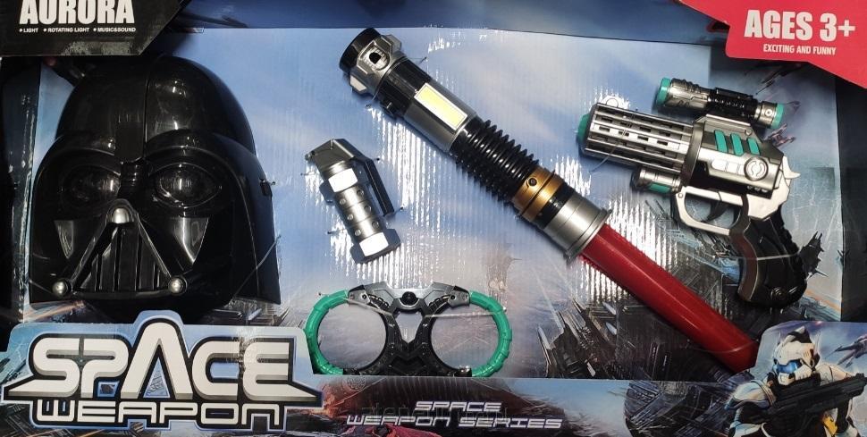 Zestaw broni kosmicznej z mieczem, maską i robotem Przedstawiamy niesamowity zestaw kosmicznej broni, który jest idealnym rekwizytem do stoczenia walki z groźnym wrogiem z odległej planety. Ta niespotykana, oryginalna broń posiada kosmiczne dźwięki i światła, co z pewnością zachęci do zabawy wszystkie dzieciaki. W skład zestawu kosmicznej broni wchodzą: - maska, robot, - pistolet, - miecz świetlny. Kosmiczny środek bojowy składa się z pistoletu oraz miecza teleskopowego. Kolorystyka tych środków obrony składa się z żywych kolorów, połączonych z intensywną czernią . Maska dołączona do zestawu zaprojektowana jest w czarnej kolorystyce,posiada okienka na oczy, dziurki w okolicy ust oraz doczepioną z tyłu gumkę, która sprawi, że podczas zabawy maska będzie pozostawać na właściwym miejscu. Maska posiada efekty świetlne, kiedy przełączymy w środku przycisk "ON" światła w oczach zaczną migać. Miecz świetlny działa po wciśnięciu guziczka znajdującego się w centralnej części uchwytu, a jego wysunięcie jest bardzo proste - wystarczy potrząsnąć nim do przodu, by pomógł zwyciężyć w walce. Pistolet po wciśnięciu spustu również świeci się i wydaje dźwięki, dlatego warto wypróbować zabawkę w ciemnym pomieszczeniu. Prawdziwy zestaw gwiezdnego wojownika nie mógłby istnieć bez walecznego robota z peleryną. Robot posiada ruchome nogi, ręce, głowę. Wszystkie te część zginają się w kilku miejscach w różne strony. Zestaw zasilany jest bateriami 3 x 1.5 V "AA", które nie są dołączone do zestawu. Wszelkie elementy kosmicznego kompletu wykonane są z wysokogatunkowego materiału, czyli plastiku. Zabawka posiada certyfikat CE, zapakowana jest w duże, kartonowe pudełko ozdobione kosmicznym motywem oraz zdjęciem robota - elementy te sprawiają, że jest doskonałym pomysłem na prezent dla chłopca. Wymiary elementów zestawu: - maska: 18 cm x 22 cm, - pistolet: 20 cm x 17 cm. Wymiary opakowania kosmicznej zabawki: - 64 cm x 33 cm x 7 cm