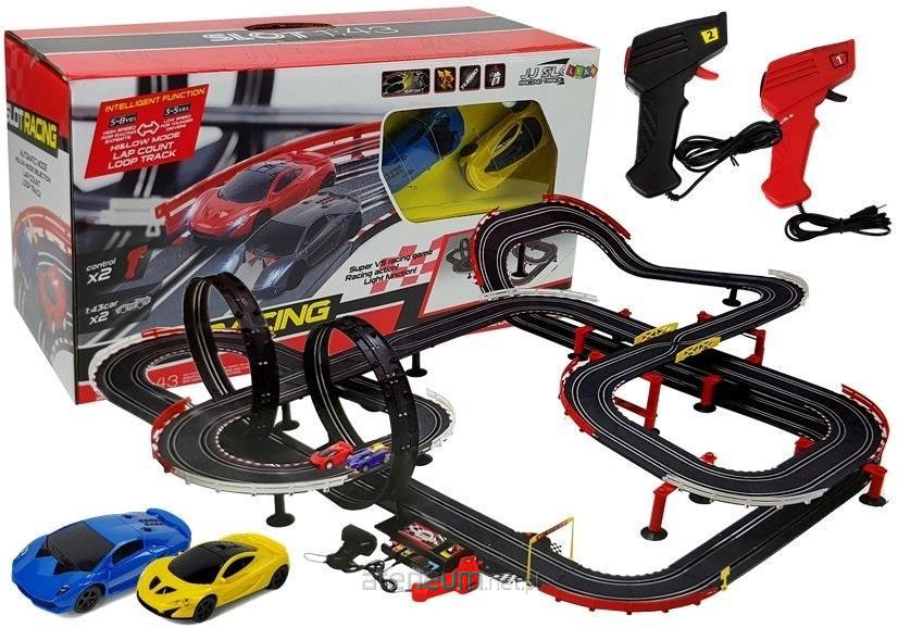 Tor Wyścigowy z Samochodzikami 2 Autka 1420 cm Turbo 1:43 Kontrolery Wyścigi jeszcze nigdy nie były tak ekscytujące! Zastanawiasz się, co Twoja pociecha znajdzie w tym zestawie? Połączenie szybkości, adrenaliny, rywalizacji i przedniej zabawy w jednym. Przedstawiamy realistyczny tor wyścigowy o imponującej długości aż 1420 cm! Duży zestaw typu Slot-Car wyróżnia się spośród innych torów specjalnym podłożem z prowadnicami, po którym jeżdżą specjalnie przygotowane do tego pojazdy. Czym odznacza się zestaw toru wyścigowego z autkami w zestawie? - pętlami, podwójnym bezkolizyjnym torem, stabilną i bezpieczną jazdą - dwoma autkami wyścigowymi - dwoma pilotami do sterowania z funkcją regulacji prędkości - możliwością równoczesnej jazdy po torach dwóch pojazdów - mnogością elementów konstrukcyjnych, z których młody pasjonat wyścigów może w prosty sposób zbudować tor swoich marzeń o wymiarach 170 cm x 184 cm - możliwością zabawy w pojedynkę oraz w dwójkę - zabawą, której końca nie będzie! Wyścigowy tor Slot Racing zaprojektowany jest do własnoręcznego złożenia, dzięki czemu może składać się z prostych odcinków, ale także i tych z ostrymi, wyraźnymi zakrętami. Zabawa ta przyniesie ogrom pozytywnych emocji nie tylko najmłodszym zawodnikom, ale i starszemu rodzeństwu czy rodzicom. Zabawkowy tor ze specjalnymi prowadnicami pozwala na rywalizację dwóch kierowców równocześnie. Poszczególne elementy konstrukcyjne pozwolą zbudować tor z ostrymi zakrętami, spiralami i odcinkami prostymi, a wszystko po to, aby maksymalnie uatrakcyjnić zabawę i dodać całej zabawie emocji. Ten niepowtarzalny zestaw to idealna zabawka dla małego amatora wyścigów samochodowych. Tor posiada 2 tryby szybkości - szybki / wolny oraz licznik przebytych okrążeń. Żywa kolorystyka, dokładne i bardzo staranne wykonanie oraz dbałość o szczegóły na pewno przyciągnie uwagę dziecka na dłużej i nie pozwoli mu się nudzić. Zestaw zapakowany jest w duże pudło ozdobione grafikami związanymi z wyścigami samochodowymi, świetnie nadaje się na prezent. Warto zwrócić uwagę na małe elementy, które wchodzą w skład zestawu, przez co zabawka dostosowana jest do wieku dzieci powyżej 3. roku życia. W skład zestawu wchodzą: - dwa sportowe autka wyścigowe - dwa kontrolery prędkości - ładowarka - tory do samodzielnego złożenia - barierki, podwyższenia i pozostałe mniejsze elementy służące do złożenia toru. Wymiary poszczególnych elementów zabawki: - samochodziki: 11 cm x 4,5 cm x 2,5 cm - kontroler: 15 cm x 9 cm, - tor wyścigowy: 184 cm x 170 cm, - długość przejazdu: około 1420 cm, Wymiary opakowania: 47.5 cm x 23 cm x 26 cm