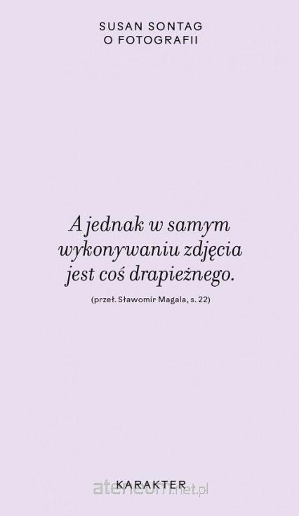 Nowe wydanie najważniejszej w historii książki poświęconej fotografii. Wybitna amerykańska intelektualistka bada znaczenie i funkcję fotografii we współczesnym świecie. Czym w swej istocie jest fotografia? Jakie są jej związki z malarstwem i sztuką? Jak zjawisko fotografii zmieniło nasz sposób postrzegania świata? W jakim stopniu fotografia interpretuje rzeczywistość? Jaka jest relacja między fotografem i obiektem oraz między zdjęciem a patrzącym? Na czym polega współczesny heroizm widzenia? Z jakich powodów sięgamy po aparat fotograficzny? Dlaczego skłonni jesteśmy przechowywać zdjęcia bliskich nam osób?