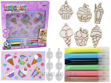 Zestaw Kreatywny Witraże Okno Zastygająca Farba Lody Słodycze 3D Malowanie zastygającymi farbkami to idealna forma spędzania wolnego czasu pozwalająca wyrazić własnego siebie. Pozwoli obudzić w sobie artystę. Jest to zabawa na wiele godzin, która doskonale wpływa na kreatywność oraz wyobraźnie. Stworzysz piękne witraże w kształcie dinozaurów, które ozdobią Twój pokój. Jak rozpocząć zabawę? 1.Wybierz ulubiony wzór na dołączonej planszy 2. Zaznacz krawędzie za pomocą czarnego linera 3. Odczekaj godzinę 4. Wypełnij środek kolorem 5. Odczekaj 2-4 godzin 6. Zdejmij swoje arcydzieło z arkusza Gotów! Teraz możesz przykleić gotową grafikę do okularów, okien, kubków i luster. To doskonały prezent na urodziny, czy inną okazję. Zestaw jest certyfikowany i bezpieczny dla najmłodszych dzieci. W zestawie znajdują się również 6 witraży w kształcie lodów i babeczek, które możemy nakleić na szybę za pomocą specjalnych przyssawek. Pisaki żelowe nie brudzą, bez problemu schodzą z rąk, wystarczy umyć je mydłem. Elementy zestawu: - zestaw 6 kolorowych pisaków do malowania żelem - 6 przyssawek - 6 witraży w kształcie lodów i słodyczy - szablon Wymiary szablonu: 22 cm x 14 cm ( 4 strony) Wymiary witraże: około 6 cm x 6 cm Wymiary pudełka: 27 cm x 28 cm x 4 cm Zabawka przeznaczona dla dzieci powyżej 3 roku życia. Ze względu na zawarte w niej małe elementy zalecana zabawa pod opieką dorosłych.