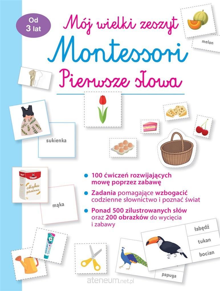 Książka zawiera ponad 100 ćwiczeń opracowanych zgodnie z zasadami pedagogiki Montessori, dzięki którym dziecko może uczyć się poprzez zabawę, rozwijając umiejętności językowe i wzbogacając słownictwo. Znalazło się tu 500 zilustrowanych słów dotyczących 20 obszarów tematycznych, takich jak dom, kuchnia, ogród, środki transportu czy kolory.