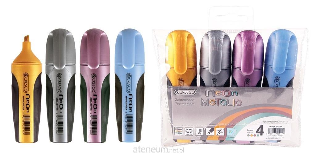 Zakreślacze NEON METALIC wielkopojemnościowe, posiadają najwyższej jakości, wysokopigmentowy tusz zapewniający wyraźne i nasycone kolory. Tusz na bazie wody. Zakreślacze doskonale piszą na wszystkich rodzajach papieru. Uchwyt gumowy, profilowany. Końcówka ścięta. Zestaw zawiera 4 kolory.