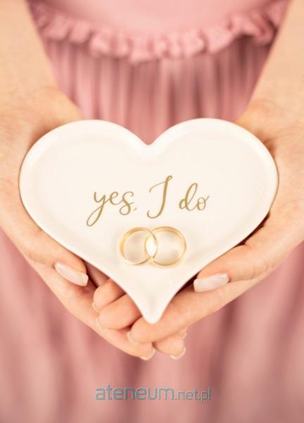 Talerzyk porcelanowy na obrączki w kształcie serca w kolorze białym z napisem "yes, I do" w kolorze złotym, wymiary ok. 133 x 10.8 cm.