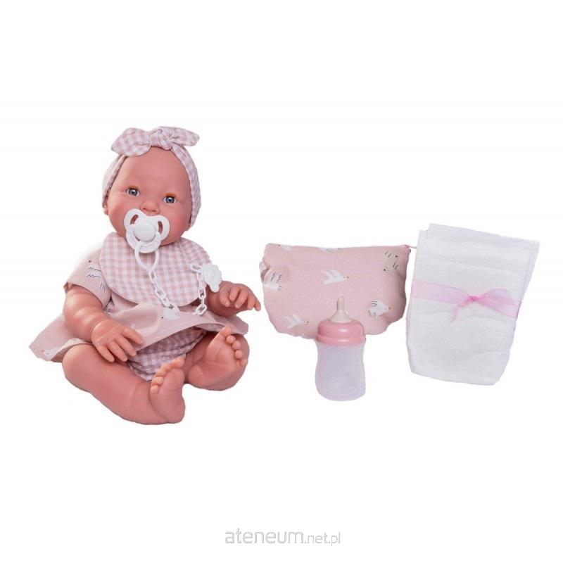 Noworodek ma na sobie różową sukienkę na krótki rękaw i kraciaste spodenki. Kreacja ozdobiona grafiką w ptaszki posiada zapięcie na rzep umieszczoną z tyłu ubranka. Stylizację uzupełnia opaska z kokardą i śliniaczek. Oba dodatki o wzorze w biało-różową kratę. Siusiający model wyposażono również w butelkę, którą można napełnić wodą, smoczek na łańcuszku z zawieszką misia i pieluszkę do przewijania zmoczonego bobasa. Producent dołączył do lali kosmetyczkę na drobne rzeczy, aby mogła mieć zawsze przy sobie.