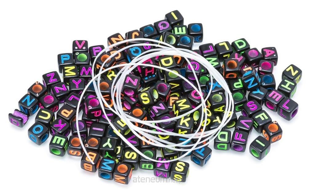 Koraliki literki + sznurek 1 m waga: 20 g kolor: czarne kostki i kolorowe literki