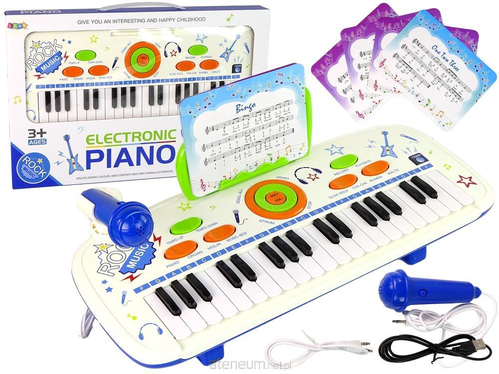 Elektryczne Pianino Keyboard Dla Dzieci Niebieski Nuty USB MP3 Pianinko to połączenie wspaniałej zabawy ze światem muzyki. Doskonały pomysł na rozwinięcie w dziecku talentu muzycznego, słuchu i wyobraźni. Dziecko odkrywa dźwięki, instrumenty, tony i rozwija swoje zdolności muzyczne. Zmysł słuchu i poczucie rytmu rozwiną się, a lęk przed obcymi pójdzie w niepamięć. Funkcja nagrywania zainspiruje go to do tworzenia własnych piosenek, może zaprosi do zabawy swoich znajomych ? Cały keyboard ma bogate wyposażenie, daje duże możliwości. Instrument posiada funkcję regulacji tempa, różnych funkcji rytmu, co umożliwi tworzenie własnych melodii. Dołączone do zestawu nuty pomogą stawiać pomogą stawiać pierwsze kroki w przygodzie muzycznej. Z tyłu instrumentu znajdują się wejścia MP3 i USB, co umożliwi podłączenia nośników zewnętrznych. Weź mikrofon w dłoń i rozpocznij swój własny występ. Małe karaoke w domu! Organki posiadają: - 37 klawiszy - podstawka pod nuty - funkcja nagrywania/programowania i odtwarzania - wejście na mikrofon - wejście AUDIO IN - skonfigurowany z odtwarzaniem MP3 - 2 głośniki - regulacja tempa - regulacja głośności Elementy zestawu: - kabel USB - mikrofon - keyboard - przykładowe nuty Wymiary keyboardu: 50 cm x 20 cm x 4 cm Wymiary opakowania: 51 cm x 34 cm x 6 cm Keyboard posiada wejścia w tylnej części jego konstrukcji. Istnieje możliwość umieszczenia w nich 4 sztuk baterii AA 1,5 V, które nie są dołączone do zestawu. Instrument posiada certyfikat bezpieczeństwa CE, przeznaczony dla każdego dziecka powyżej 3. roku życia. Zapakowany jest w oryginalne pudełko, dzięki czemu doskonale nadaje się na prezent.