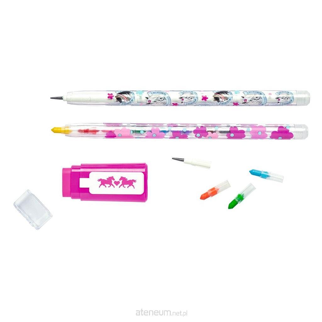 Ołówek i Kolorowa Kredka z wymiennymi wkładami + Gumka, Konie, Zestaw 3w1 Zestaw: ołówek, kredka świecowa w plastikowej oprawie z wymiennymi końcówkami i gumka w jednym - brzmi niewiarygodnie? Ołówek, kredka i gumka, 3w1 to prawdziwie wszechstronne urządzenie i wyjątkowa atrakcja w piórniku. Składa się z elementów połączonych nasadką ze zintegrowaną gumką. Dzięki wielu różnym końcówkom, które można łatwo wymieniać, ołówek i kredka zapewniają niemal nieograniczoną zabawę w pisanie i rysowanie. A co najlepsze: żadne irytujące ostrzenie nie jest konieczne. Design zestawu sprawia, że serce każdego miłośnika koni bije szybciej: świecowa kredka ozdobiona jest pięknymi kwiatami, a ołówek podkowami i uroczymi końskimi głowami. Zarówno ślady ołówka, jak i błędy popełnione kredką świecową można łatwo usunąć za pomocą gumki. Piękny ołówek, kredka świecowa i gumka w kolorze nasadki będą eleganckim dodatkiem do twojego piórnika. Nasadka w zestawie może być w kolorze: fioletowym, żółtym, turkusowym, jasno lub ciemnoróżowym Ołówek posiada wymieniane końcówki. Kredka posiada 11 różnokolorowych końcówek. W każdym zestawie takich samych. Kolor kredki zmieniamy przekładając końcówkę na koniec plastikowej obudowy. Gumka zintegrowana z podwójną nasadką, tworzy praktyczną całość. Wymiary gumki: 1,5 cm x 1 cm x 0,5 cm. Wymiary ołówka i kredki: 14 cm x 0,6 cm x 0,6 cm. Produkt wysyłany losowo.