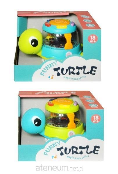 Plastikowy muzyczny żółwik. Żółwik wydaje m.in dźwięki bębenka lub gra melodie. Świeci również kolorowymi światełkami. Wewnątrz znajdują się również małe żółwiki, które grzechoczą. Zabawka działa na baterie typu AAA. Baterie nie są załączone do zabawki. Zabawka występuje w kilku wersjach kolorystycznych, wybierany losowo. Cena dotyczy jednej sztuki. Produkt zapakowany w kartonowe opakowanie z okienkiem. Zabawka dla dzieci od 18 miesiąca życia.