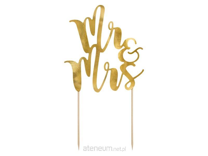 Topper na tort Mr&Mrs, wykonany z papieru lustrzanego w kolorze złotym, wysokość ok. 25,5 cm.