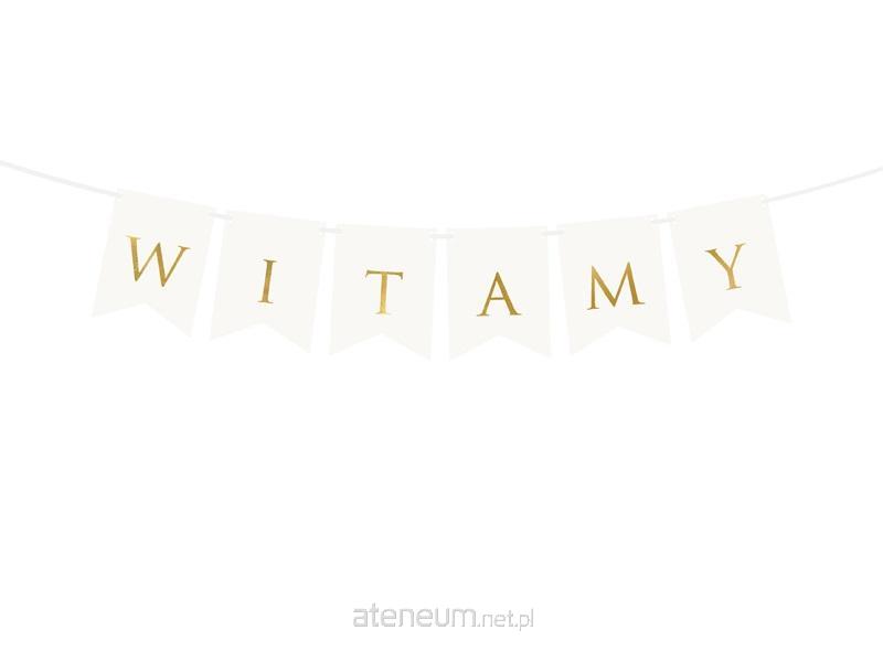 Baner w kolorze białym ze złotym napisem Witamy, do samodzielnego złożenia, zestaw zawiera literki i ok. 2,5 m białej tasiemki, wymiary po złożeniu: wysokość ok. 15 cm, długość ok. 80 cm.