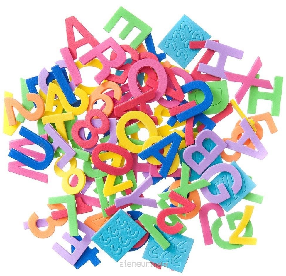 Zestaw naklejek z pianki zawierający litery i cyfry. Dodatkowo wzbogacony haczykami i kreskami, które pozwolą stworzyć polskie litery (ą, ć, ę, ł, ń, ó, ś, ź, ż)