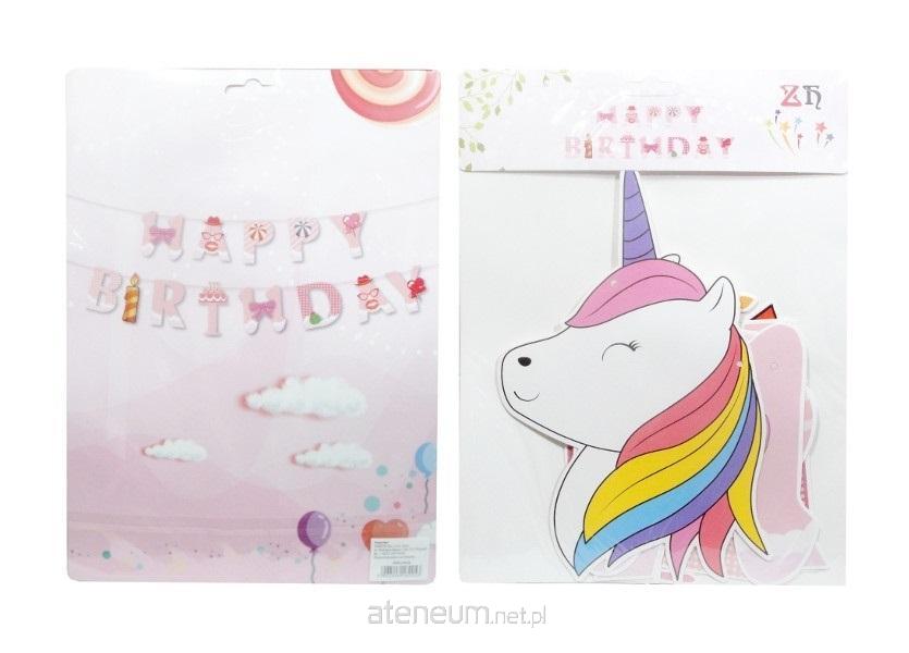 Jednostronna, papierowa, ozdobna girlanda z napisem Happy Birthday z jednorożcem (do samodzielnego złożenia). Produkt zapakowany w przezroczysty worek. Podane wymiary są wymiarami opakowania.