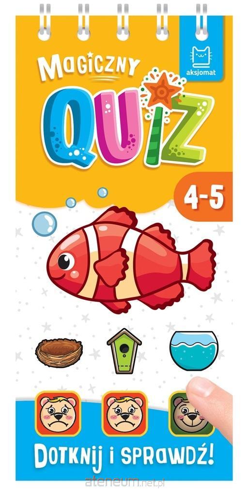 "Magiczny quiz" to doskonała zabawa dla dzieci. Magiczna farba zapewnia wielokrotną zabawę i zachęca dzieci do sprawdzania swojej wiedzy oraz poznawania świata. Czarne pola znikają i pojawiają się na nowo. Aby wskazać odpowiedź, należy delikatnie potrzeć pokryty farbą termiczną kwadracik przez około 5 sekund - pod wpływem ciepła pojawi się znaczek poprawnej lub błędnej odpowiedzi. W książce zamieszczonych jest 76 pytań obrazkowych wraz z odpowiedziami. Quiz to pomysł na udany prezent i interesującą naukę.