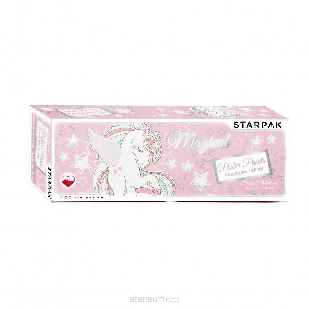 Farby plakatowe STARPAK to gęste farby wodne o kremowej konsystencji. Całkowicie bezpieczne dla dziecka dzięki użyciu bezpiecznych składników. Ten rodzaj farb charakteryzuje się intensywnymi i czystymi kolorami. Po wyschnięci kolory są matowe, ale nadal bardzo intensywne. Dodatkowo farby są kryjące, łatwo więc zamalować ewentualną pomyłkę lub niedociągnięcie