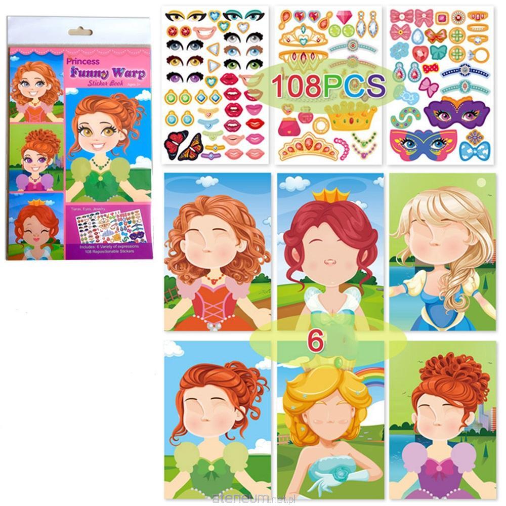 6 kart z postaciami księżniczek, które trzeba wykończyć naklejkami takimi jak buzia, oczy, uszy itp.. 108 naklejek w zestawie. Wymiary opakowania: 14.5 x 0.3 x 24 cm.