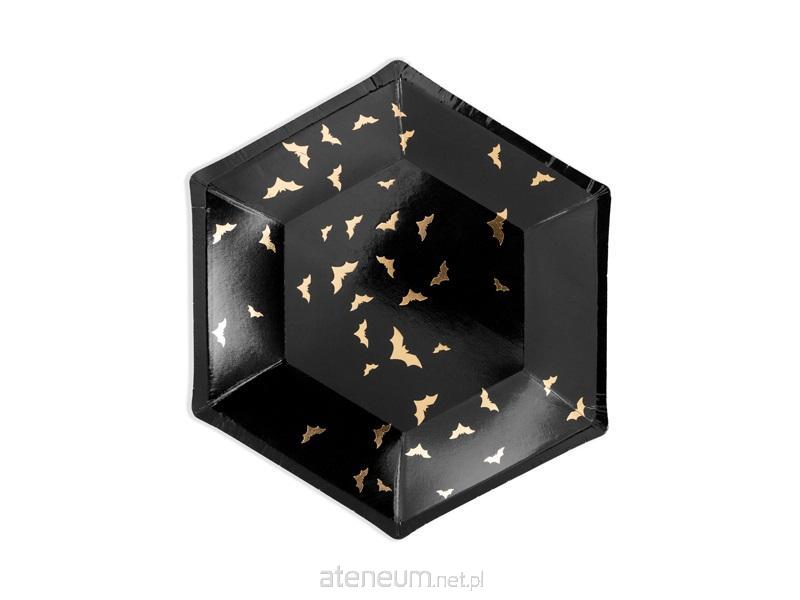 Talerzyki papierowe Trick or Treat w kolorze czarnym ze złotym wzorem, średnica ok. 20 cm.(1 op. / 6 szt.)