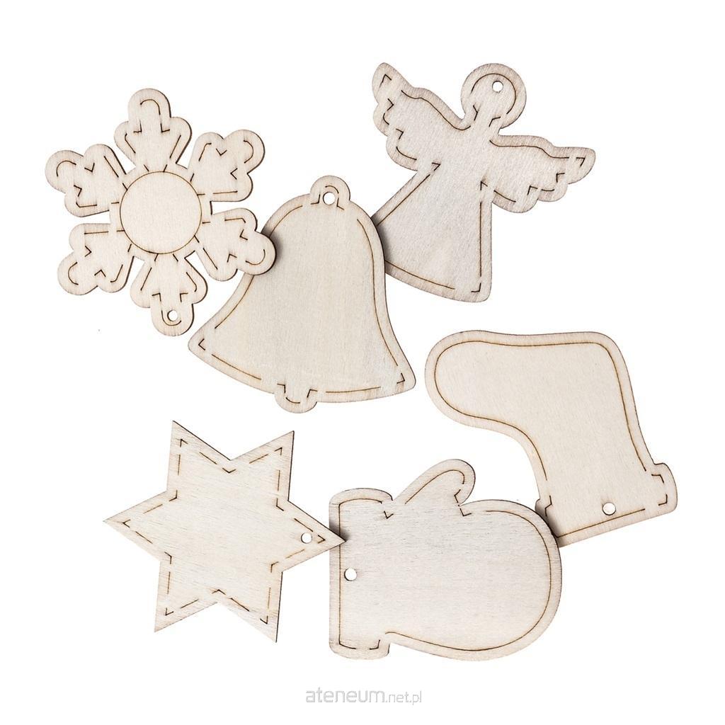 Drewniane zawieszki w czterech, świątecznych wzorach: aniołka, dzwoneczka, śnieżynki, skarpety, gwiazdy i rękawiczki. Są doskonałą bazą do kreatywnych prac dla dzieci i dorosłych.