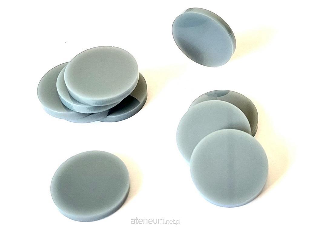 Zestaw 10 żetonów o średnicy 22 mm, wykonanych ze szkła akrylowego o grubości 3 mm. Znaczniki będą użyteczne w grach bitewnych, RPGach, grach Print & Play, w prototypach gier planszowych, jako zamienniki elementów oraz przy wprowadzaniu własnych modyfikacji zasad do gier. Po żetonach można pisać mazakami suchościeralnymi. Do czyszczenia PMMA (szkła akrylowego - plexi) nie należy używać żadnych środków na bazie alkoholi. Polecamy wodę z mydłem, a w przypadku silnych zabrudzeń - cytrusowe środki czyszczące.