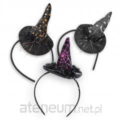 Czarny z białą pajęczyną i pająkiem oraz białymi włosami. Średnica kapelusza 38 cm, wysokość: 33cm.