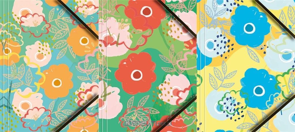 Teczka kartonowa z grafiką i gumką narożną, format A4, lakierowana. Wymiary teczki 320x240 mm. Dostępne w czterech zestawach, w każdym zestawie - 3 różne grafiki (M1-owoce, M2-liście, M3-pastelowe kwiaty, M4-róże). Opakowanie: folia 6 szt.