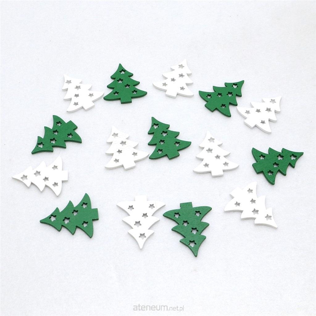 Drewniane choinki w kolorze zielonym i białym to idealny dodatek do świątecznych prac. Każda choinka posiada z jednej strony samoprzylepną kropkę, która ułatwia ich wykorzystanie. Ozdobisz nimi kartki okolicznościowe, opakowania na prezenty i świąteczn