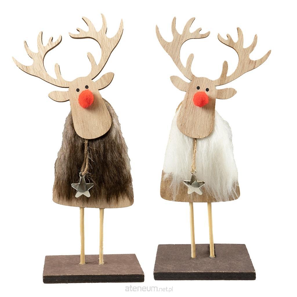 Urocza stojąca dekoracja świąteczna - renifer z futerkiem na brzuchu i zawieszką w różnych kształtach. Renifer jest wykonany z drewna, a jego nos to czerwony pomponik. Idealna ozdoba do domu lub pomysł na upominek. Wysokość dekoracji: 20 cm.