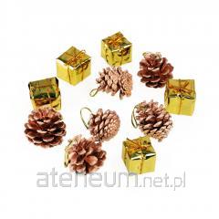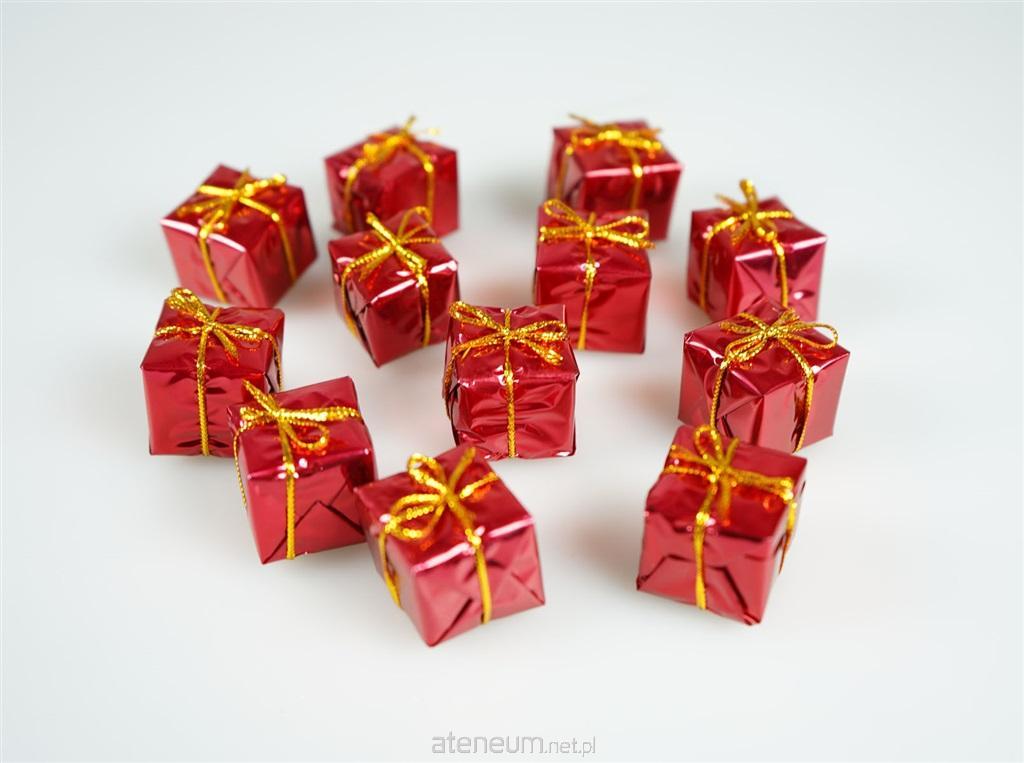 Zestaw 12 sztuk ozdób w kształcie pudełeczek - prezencików. Prezenciki w kolorze czerwonym. Możliwość użycia do dekoracji choinki lub świątecznych stroików i kompozycji. Dekoracje w rozmiarach 2,5x2,5 cm.