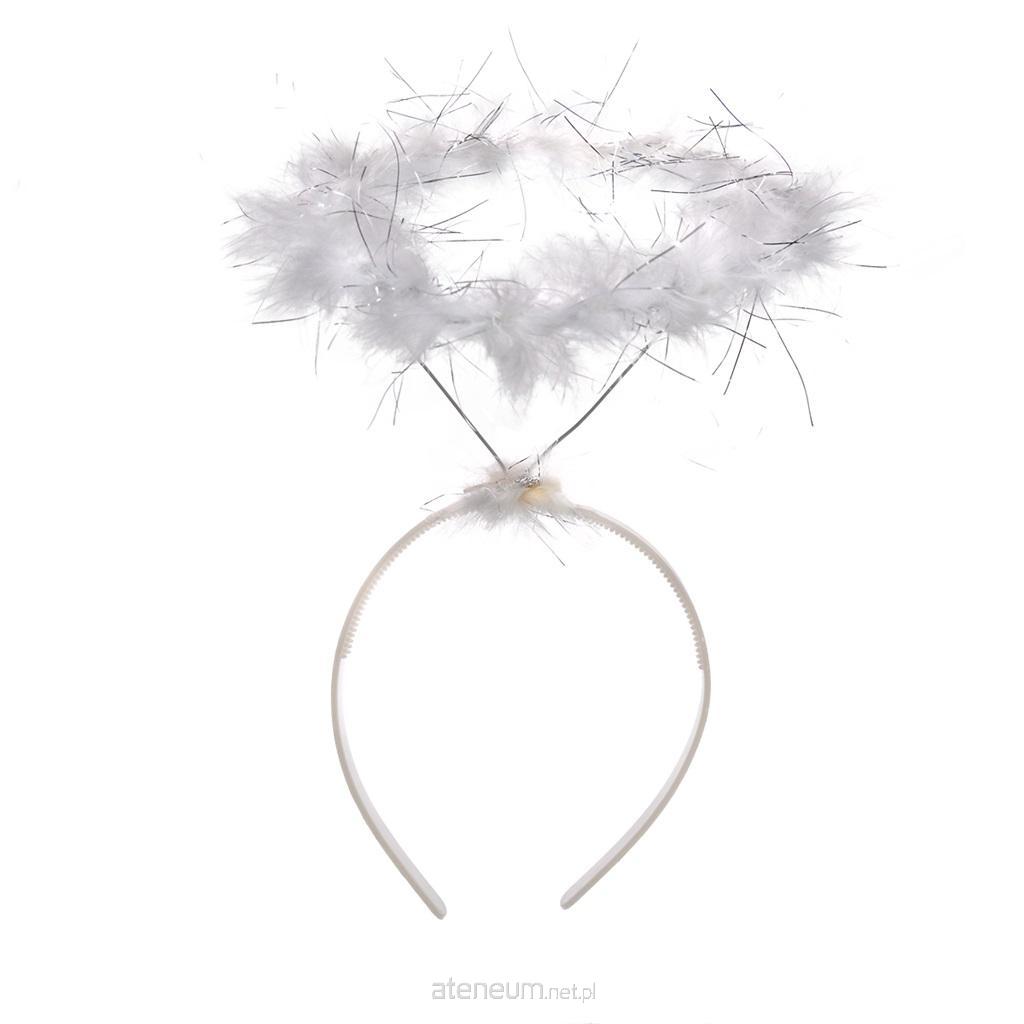 Piórkowa aureola na białej opasce. Wymiary: opaska 12x13 cm, drucik 9 cm, średnica aureoli ok 16 cm
