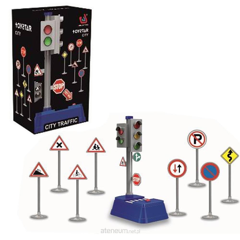 Wysokie (23 cm) światła uliczne na baterie. Oprócz tego w zestawie osiem różnych znaków drogowych.