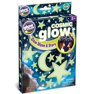 Kosmiczne Glow to wysokiej jakości, plastikowy, świecący w ciemności księżyc i gwiazdy. Stwórz magiczny widok Księżyca i gwiazd na suficie i ścianach za pomocą samoprzylepnych podkładek. Mogą być również używane jako akcesoria do podręczników szkolnych, toreb i mebli. Idealny, zabawny, ale edukacyjny prezent dla dzieci, które interesują się nocnym niebem. Zestaw zawiera 1 księżyc, cztery duże gwiazdy i 15 małych gwiazd. Opakowanie i instrukcje są wielojęzyczne, w tym angielski, francuski, niemiecki, hiszpański oraz włoski.