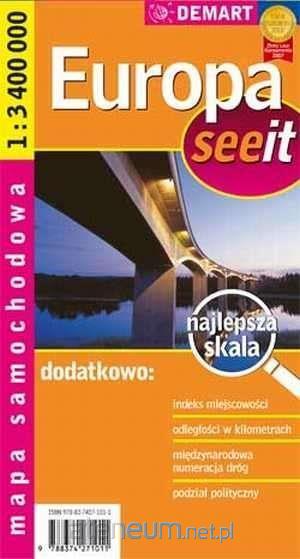 skala: 1:3 400 000Mapa samochodowa Europy uwzględniająca podział polityczny, międzynarodową numerację dróg, kilometraż.