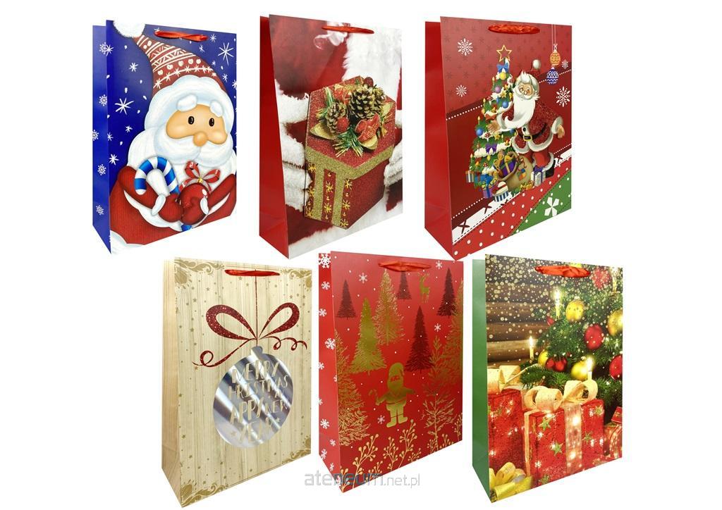 Torebka prezentowa ze świąteczną grafiką. Gramatura papieru 210, torebka laminowana folią mat z dodatkowym uszlachetnieniem (typu brokat/złocenie/srebrzenie/efekt 3D). Wielkość: 300x415x120 mm (L)