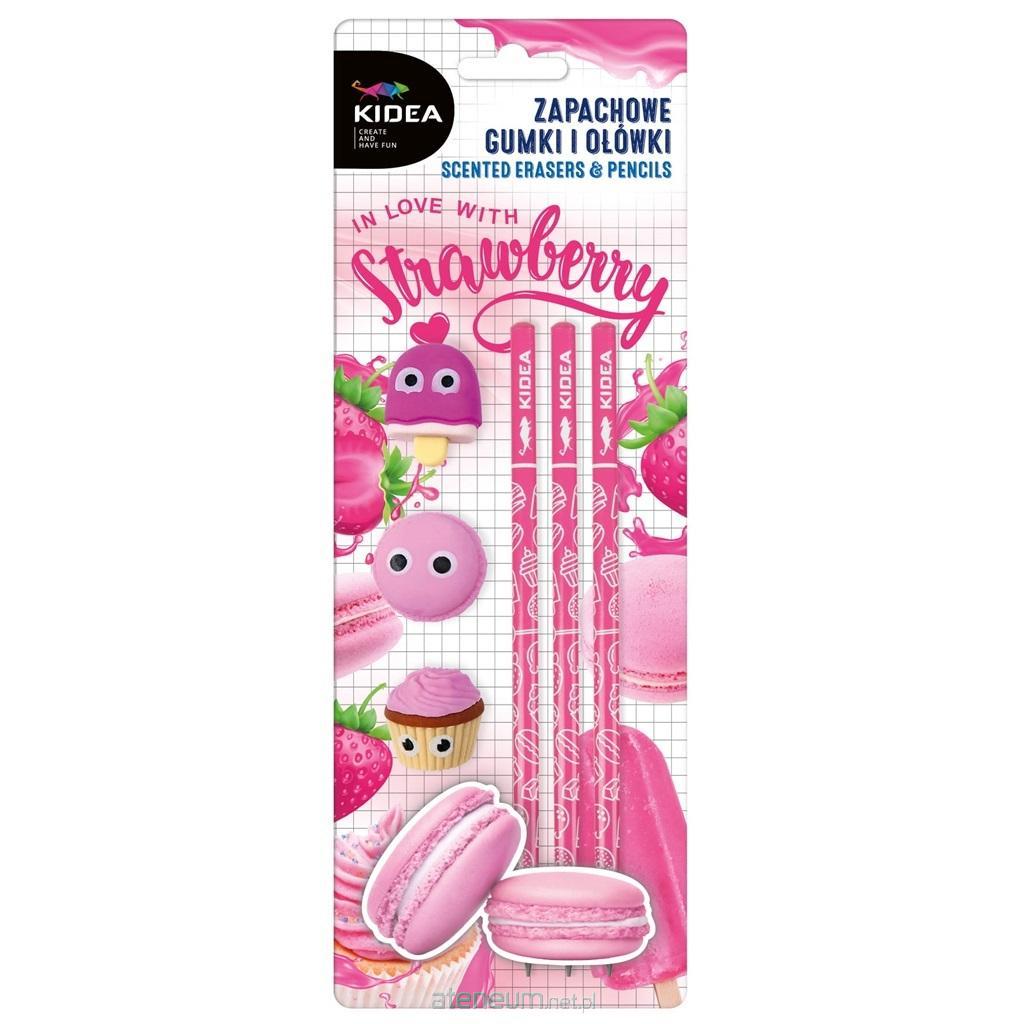 Zapachowy niezbędnik Kidea o słodkim, truskawkowym aromacie, który zawiera 3 ołówki o twardości rysika HB oraz trzy smakowite gumki w kształcie loda na patyku, makaronika i babeczki. Średniej twardości rysik i trójkątny kształt sprawiają, że ołówki są poręczne i wygodne w użyciu.