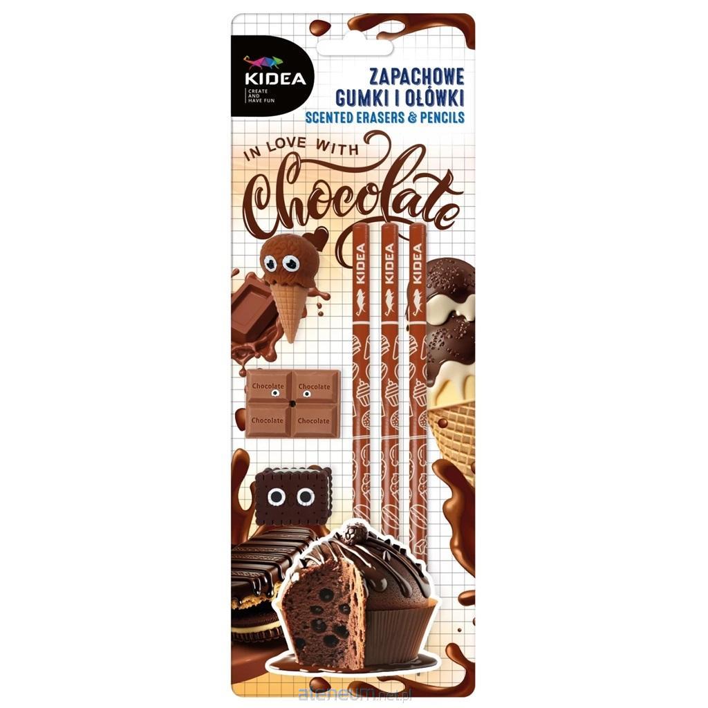 Zapachowy niezbędnik Kidea o słodkim, czekoladowym aromacie, który zawiera 3 ołówki o twardości rysika HB oraz trzy smakowite gumki w kształcie babeczki, czekolady i ciasteczka. Średniej twardości rysik i trójkątny kształt sprawiają, że ołówki są poręczne i wygodne w użyciu. Zapachowe gumki nie tylko słodko się prezentują, ale również precyzyjnie wymazują ołówek. Sprawdzi się zarówno na lekcji matematyki jak i plastyki, a jego czekoladowy zapach umili dzień spędzony w szkolnej ławce.