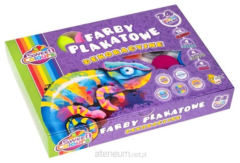 Farby plakatowe dekoracyjne 24 kolory: 12 standardowych + 4 neon + 4 metalic + 4 brokaty.